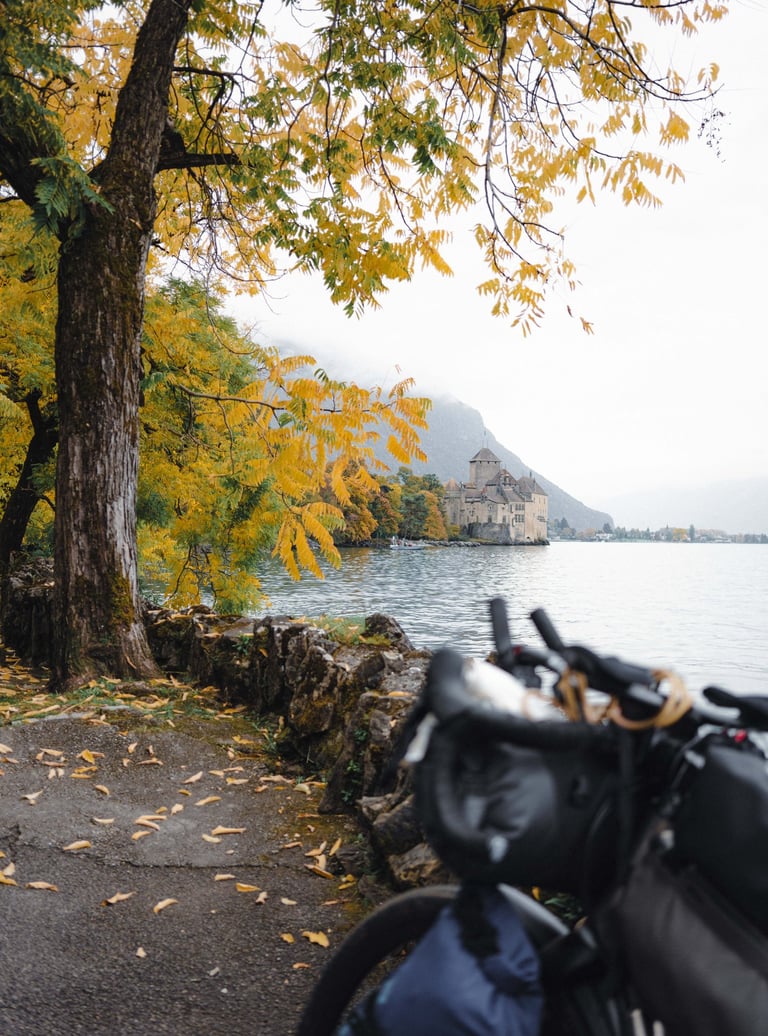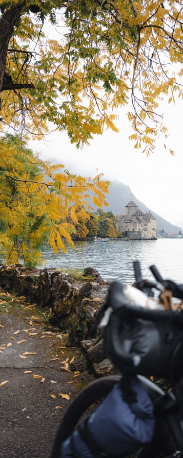Riding along the lake is stunning. The winemakers are out working on these steep vineyards, they even have little mini trains to help haul everything up and down. After Montreux, I leave the main road and take the pedestrian path right along the lakeside, passing by Chillon Castle, super scenic… and super touristy haha.
